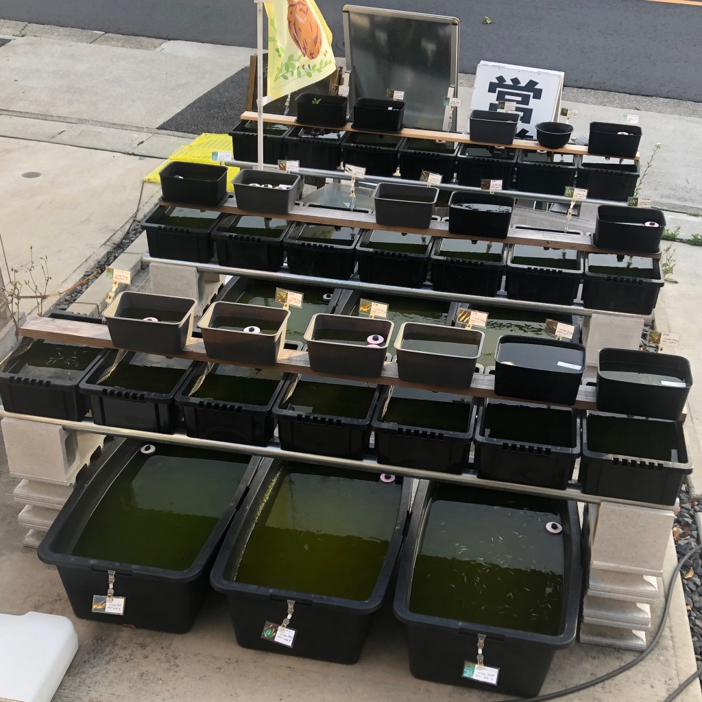 Hanagara Animal Cafeではメダカの繁殖、販売をしております。店頭にたくさんのメダカ・金魚が品種ごとに容器に入っておりますので、お好きな魚をすくって店内までお持ちください。お持ち帰り用の容器に入れて販売いたします。